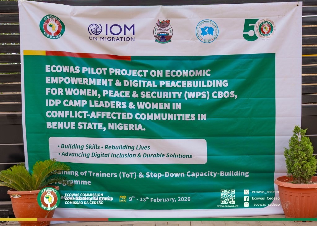 10 Feb, 2026Makurdi, Nigeria — La Communauté économique des États de l’Afrique de l’Ouest (CEDEAO), par l’intermédiaire de sa Direction du commerce en collaboration avec la Direction des affaires humanitaires et sociales, s’est associée au gouvernement de l’État de Benue pour mettre en œuvre une initiative pilote axée sur l’autonomisation économique et la consolidation de la paix numérique pour les organisations communautaires œuvrant dans le domaine des femmes, de la paix et de la sécurité (WPS) dans l’État de Benue, au centre-nord du Nigeria.
