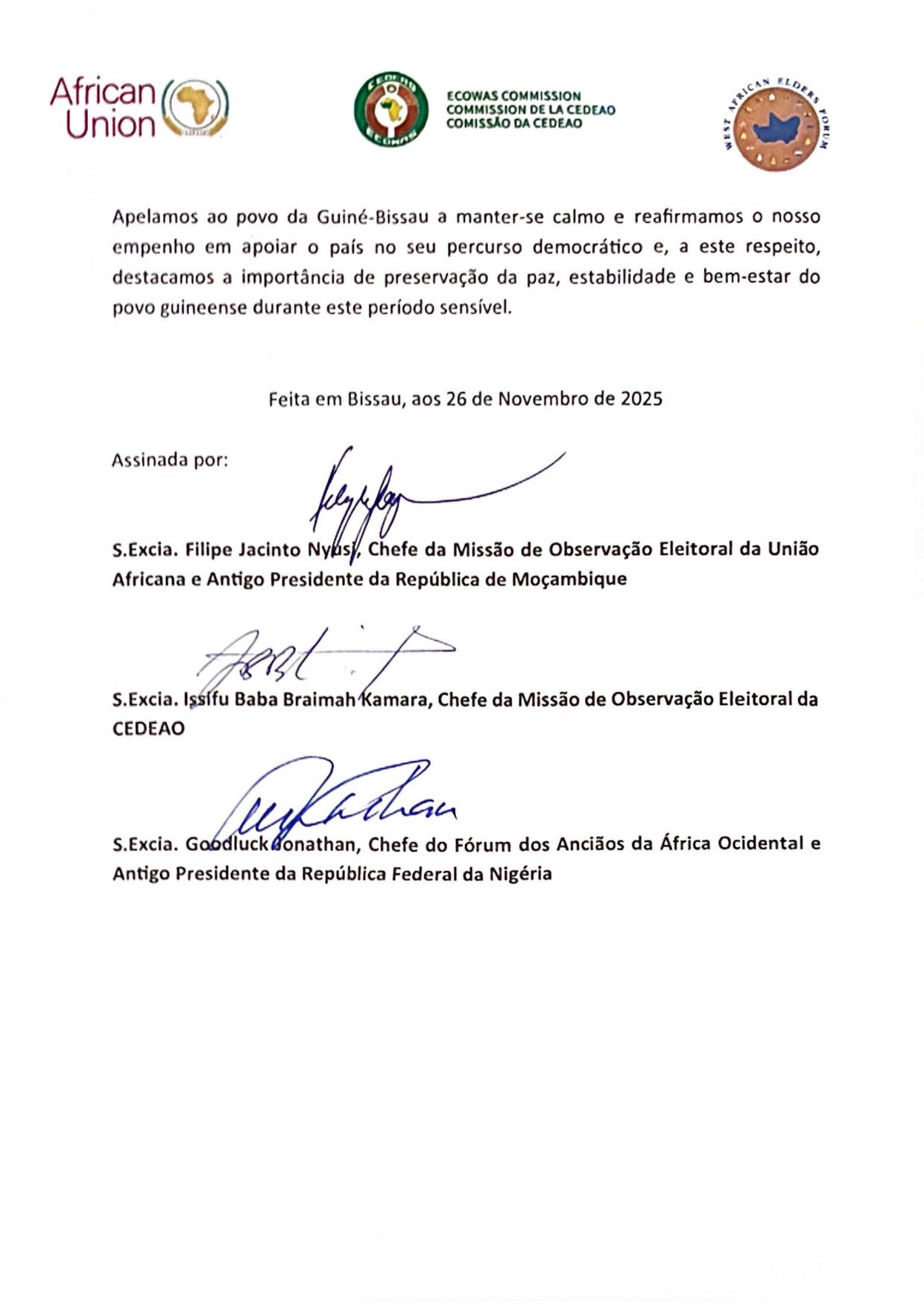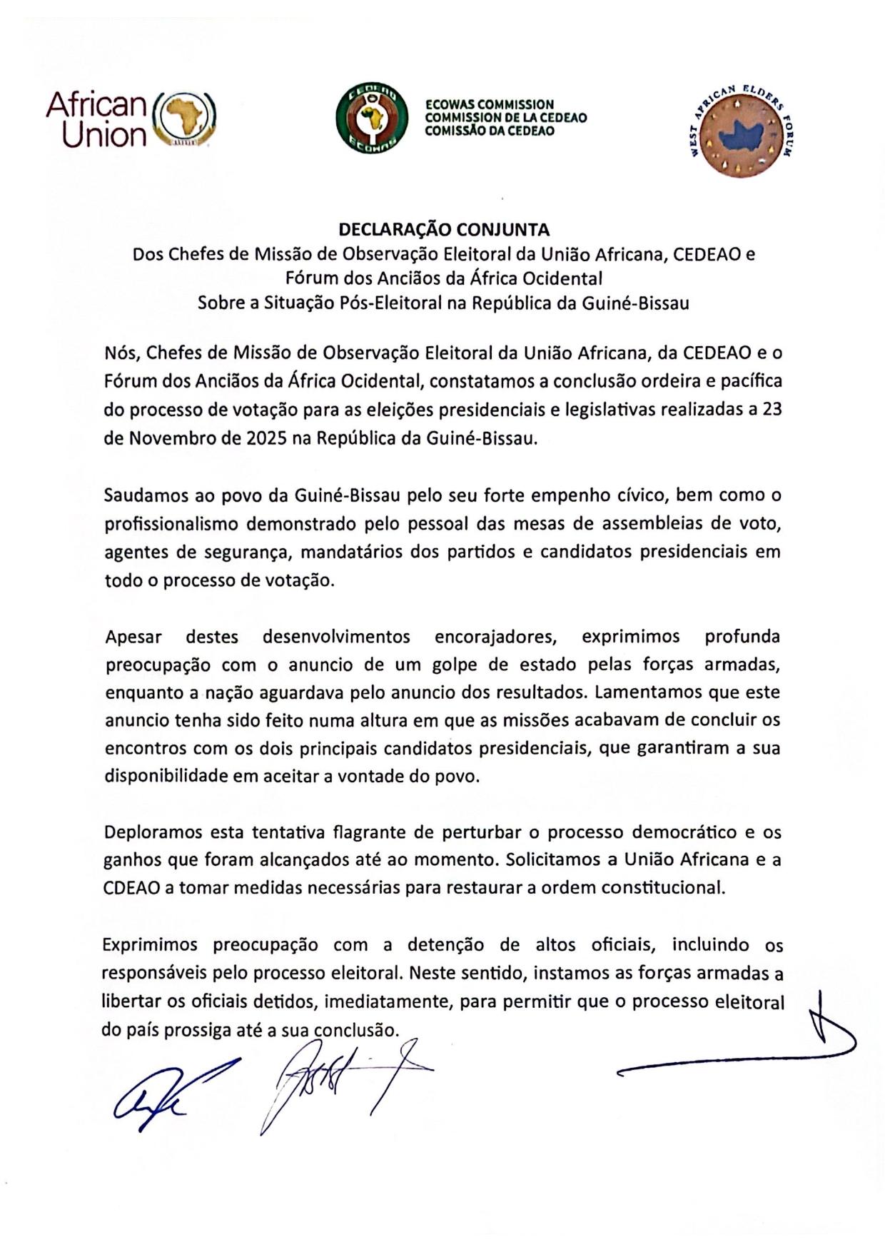 Declaração conjunta do chefe da missão eleitoral da CEDEAO, do chefe da missão eleitoral da União Africana e do fórum dos anciaõs da África ocidental sobre a situação pós-eletoral na república da Guiné-Bissau.