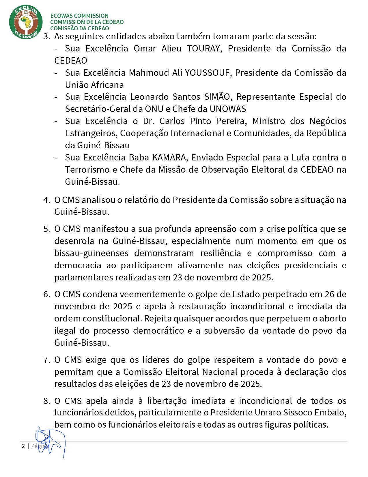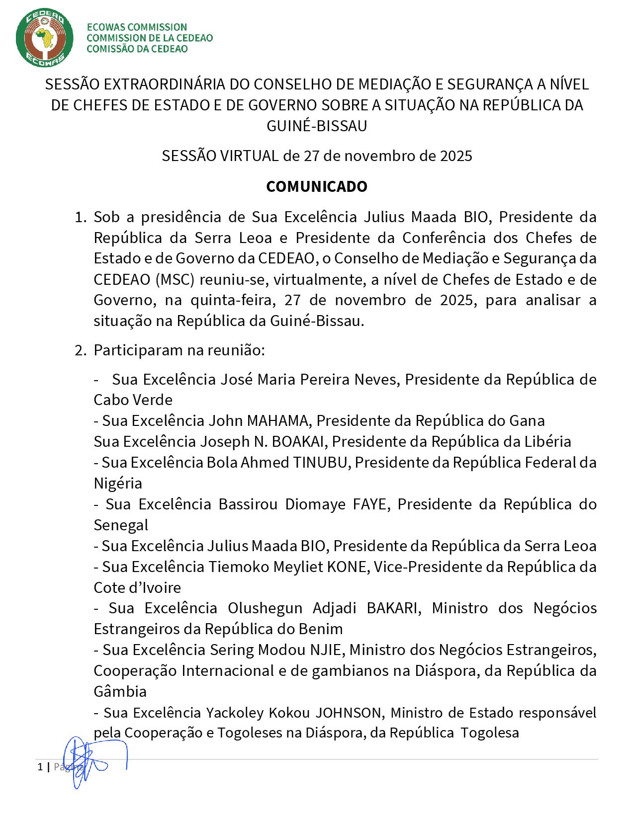 Comunicado FinaL da CImeira Virtual Extraordinária dos Chefes De Estado e de Governo da CEDEAO sobre A situação na Guiné-Bissau. 27 de novembro DE 2025.